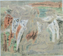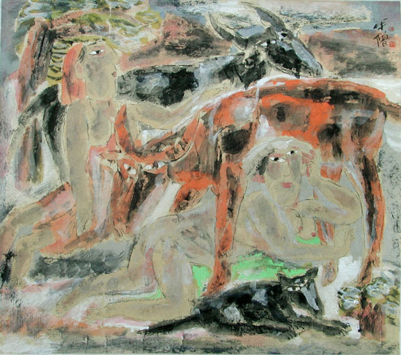 Hai’s people and animals were free, dreamily wandering on the grasslands or in woods or beside streams. They appeared to be in complete harmony with nature. His women were sexy, and graceful, as if goddesses often flew across the paintings; his animals quick-witted, their eyes wide-opened, often emerged near the women. A Buddhist who believed in gods and the soul and samsara, he let his world become an illusion of the past, present and future life. You can feel the most mythical humankind in his paintings. He painted them as simply and unadorned as Chagall, as freely distorting as Picasso.