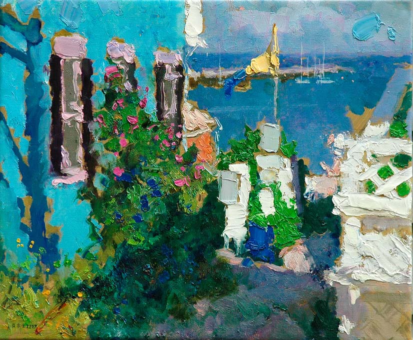 Zhang Jing Sheng ( b. 1940- ) is a devoted painter who for many years studied color. Of course there were influences from impressionism, but he has his own style. He tried to reveal the intensity of color, often working with a palette knife to let his colors reach their most brilliant and richest point. He painted in layers, alternating the thick and the thin to give his colors a dynamic tension. There were also influences from ink painting in that he manipulated the emptiness and fullness, the tinting of colors, the flowing of energy as would an ink painter.