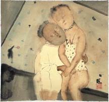 Li Wang’s private world is quiet, peaceful and gentle; an atmosphere of humor and grace pervades everything. Girls lay in bed as if they don’t know they are striking a pose, naturally, carelessly showing off their beauty. This is a fantasy of a Chinese intellectual. Not much is provoking. The girls are elegant and smart, but still sexy and playful, and most importantly, beautiful and sluggish. His intention is obvious. A single rose lies by the side of a girl. Sometimes, Li Wang includes himself in his painting, a lonely man with old-fashion round black frame eyeglasses, sitting by a girl’s side or holding a girl on his leg, admiring while looking at or drawing them. His humor and gentle romanticism are hidden somewhere in the painting. There is always a lone crow, a symbol of his soul in his world, but most of the time no other companion. But he is comfortable with himself, his book, his bird, enjoying his quiet state.